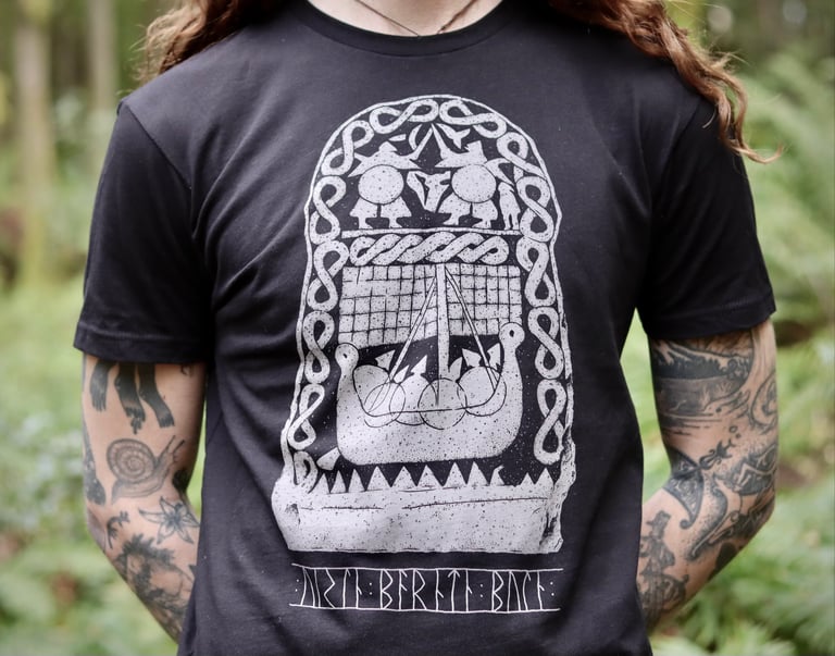 An artistic rendition of a runestone in Gotland, Sweden with the text "Feast Fight Fuck" translated into Old Norse by Dr. Mathias Nordvig.